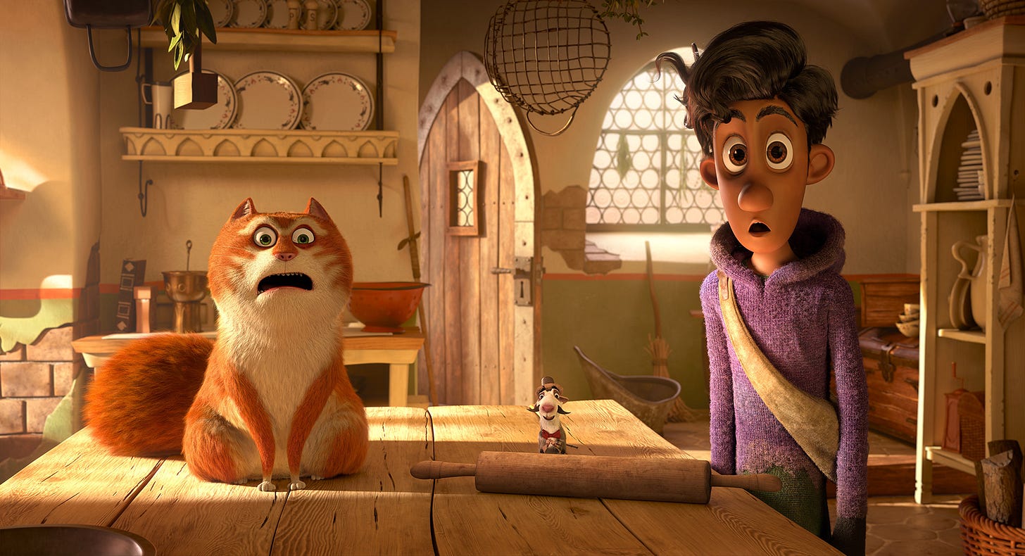 Because it’s ultimately both hers (the daughter of the mayor of a town in the midst of a famine due to a rat infestation stealing food despite a rat-catcher—David Thewlis’ Boss Man—assuring that the rats have been caught) and Maurice’s (Hugh Laurie) tale to tell. Her way is through genre tropes, comparing the beats of reality to those of a book in her collection about a talking rabbit living in harmony with humans while also living that reality as though it must follow those beats exactly (no matter how far-fetched doing so would prove) because one must create their own story so as not to become part of someone else’s. His way is through motivations, appealing to the audience’s good nature to understand that his being a cat (despite his speech and intelligence) allows him some latitude for a penchant to being selfishly aloof.