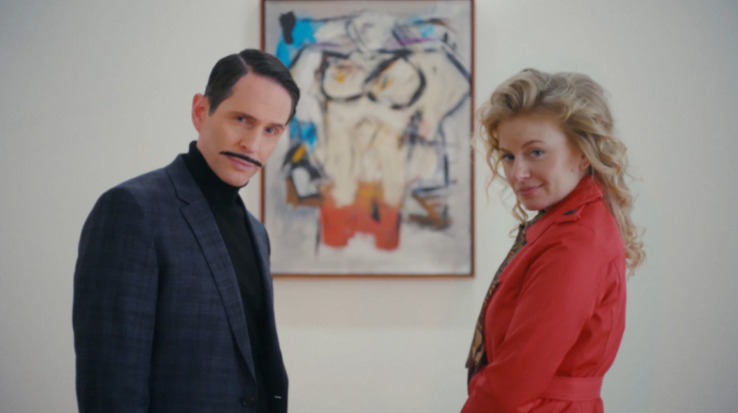 Because Jerry and Rita Alter (performed in comedic re-enactments by Glenn Howerton and Sarah Minnich respectively) shouldn’t have been able to hang Willem de Kooning’s “Woman-Ochre” on their bedroom wall. They probably shouldn’t have been able to travel to exotic locales three times a year annually either, but we’re trained to not question such things. Maybe they came from money (because their salaries surely weren’t enough). Maybe they just knew where to find great deals. No one automatically thinks larceny. Not when peering at these two smiling lovebirds sharing their slideshows and souvenirs. People aspired to have what they had. Jerry and Rita were a nice wholesome couple to all but a handful of those with a bit more intimate knowledge about those trips. And if they’re willing to not be flashy about their crimes, why look any deeper?