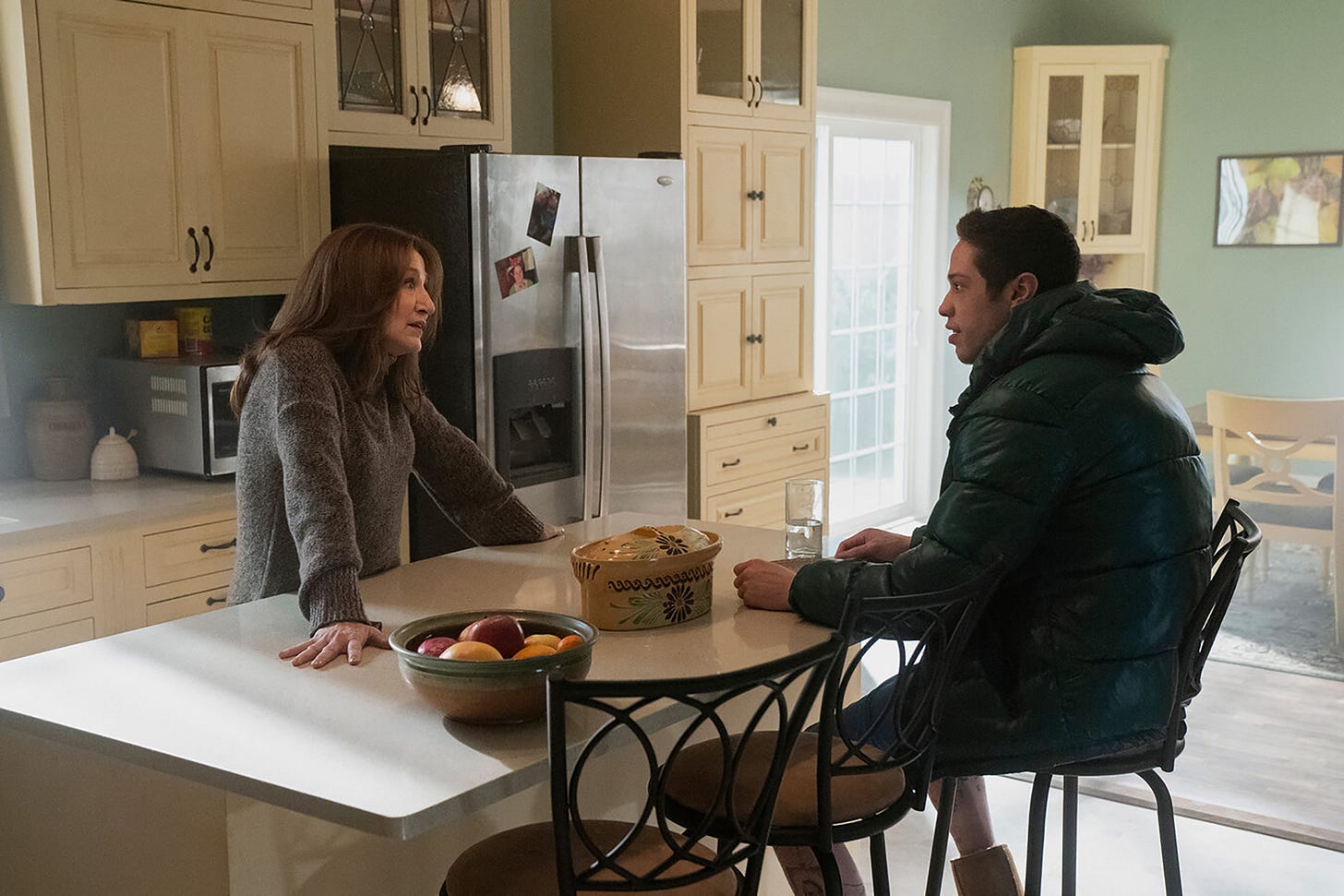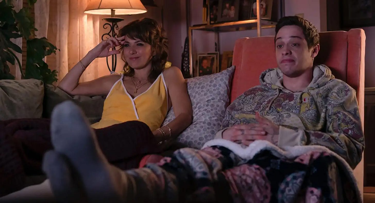 Scott (Pete Davidson) has been able to coast by as a freeloader under his widowed mother’s (Marisa Tomei’s Margie) roof this long (his father died battling a fire when he was seven) because his younger sister Claire (Maude Apatow) was there as a buffer. As long as Mom put her upbringing at the forefront, Scott could ride the wave of free meals and no rent. So, when she goes off to college, the dynamic can’t help but shift. It doesn’t necessarily have to if he got his head far enough out of his backside to realize that companionship and empathy would go a long way towards continuing this domestic arrangement, but we’re talking about a selfish, self-pitying twenty-four-year-old stoner who’s been “finding himself” for a decade. Scott is therefore an adult. Margie doesn’t need to cater to his whims. She can date. Redecorate. Finally kick him out of the nest.